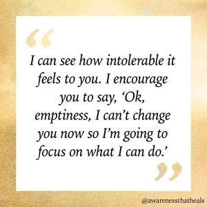 FRIENDLY MIND: I can see how intolerable it feels to you. I encourage you to say, “Ok, emptiness, I can’t change you now so I’m going to focus on what I can do.”